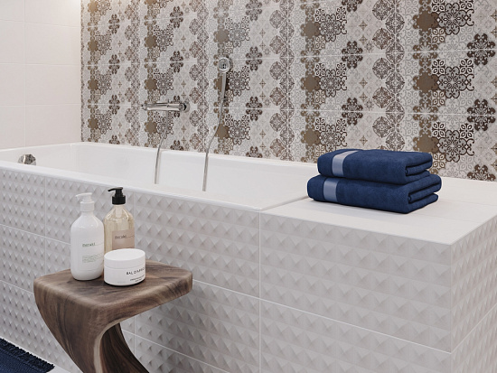 Современная динамичная коллекция ALRAMI привлекает внимание ярким растительно-геометрическим орнаментом. В этой коллекции матовая, бархатистая текстура фоновой плитки удачно сочетается с рельефным рисунком вставок. Объёмный декор в виде пирамид позволяет интересно обыграть функциональные зоны. Разнообразие элементов открывает большие возможности для комбинирования и создания стильного европейского интерьера даже в небольшом пространстве.