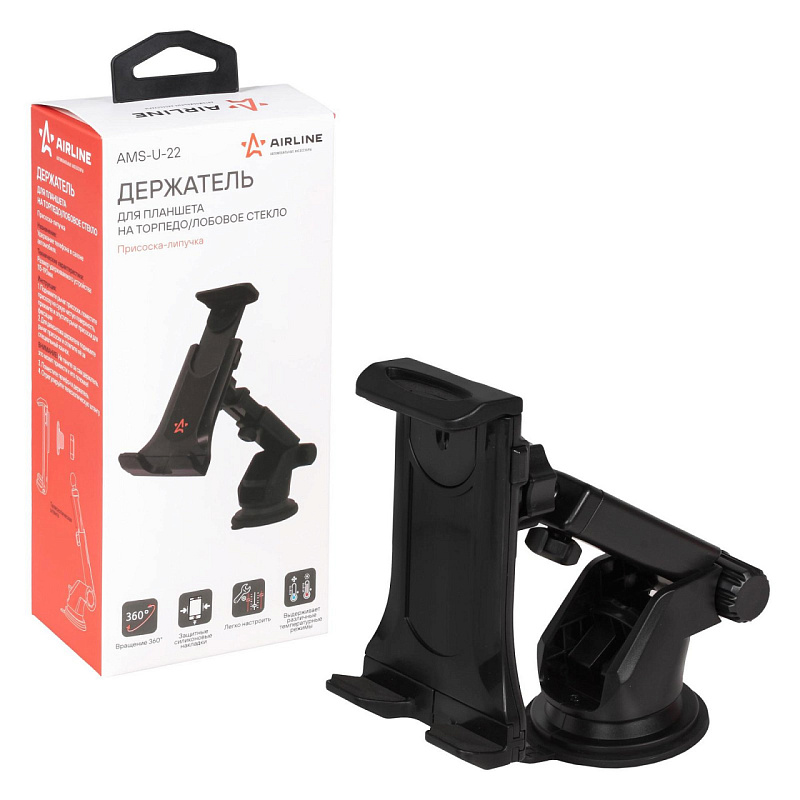Держатель обладает широким диапозоном настроек. Удерживать планшет помогают выдвижные лапы в нижней части держателя. Держатель обладает телескопическим удлинителем и шарниром в месте крепления устройства.