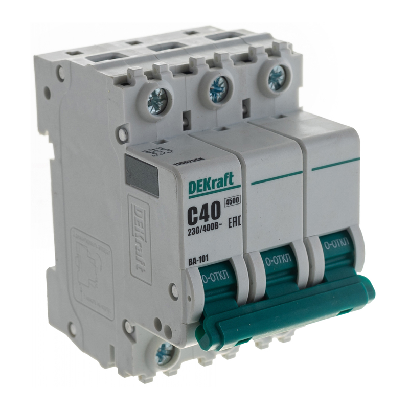 Автоматический выключатель серии ВА-101 DEKraft, 3P, номинальный ток 40 А, характеристика С, отключающая способность 4,5 кА. Новый механизм расцепления мгновенно разрывает цепь при возникновении аварии. 5 монолитных заклепок повышают прочность корпуса аппарата. Сплошная лицевая панель обеспечивает безопасность эксплуатации аппарата. Боковые каналы охлаждения повышают стабильность работы при высоких температурах окружающей среды. Полностью автоматизированный контроль качества производства.