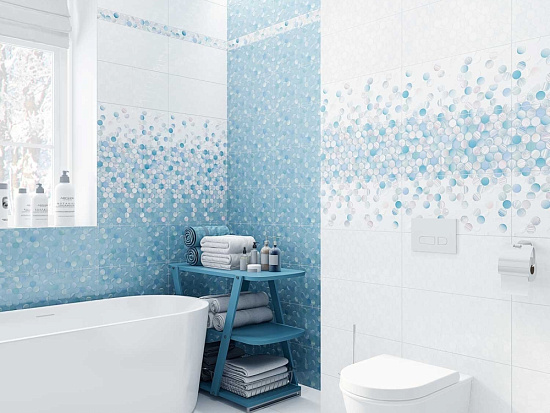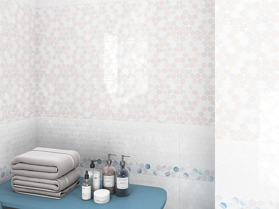 Дизайнеры выбрали традиционную для ванных комнат «водную» цветовую палитру – бело-голубую. Она прекрасно гармонирует с сантехникой, зеркалами, хромом, создает умиротворяющее настроение. Изюминка серии – необычный узор, который изображает мелкую мозаику, но не привычную квадратную, а круглую. Декор – рельефный, с чипами бледно-кораллового, розового, лилового, бирюзового, зеленоватого цвета, с рисунком, стилизованным под морские ракушки. Есть возможность уложить модули с переходами тона, а сочетая фактурную плитку с гладкой – зонировать пространство по своему вкусу.
