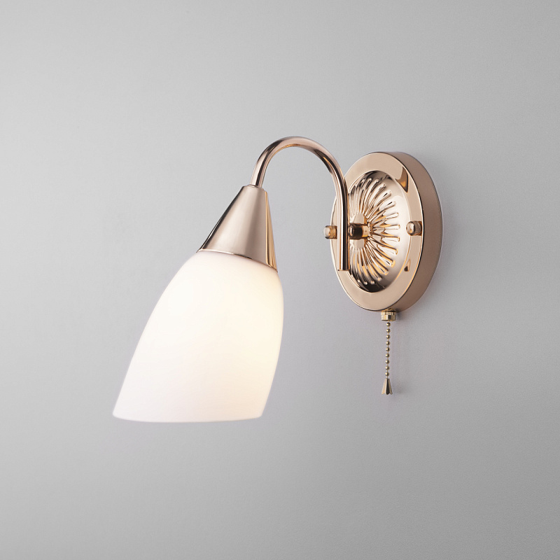 ра со стеклянным плафоном 30149/1 золото создаст качественное дополнительное освещение и станет эффектным дополнением к основному источнику света. Благодаря белому стеклянному плафону бра создает мягкое равномерное свечение, подходящее для комфортного чтения книг в вечернее время. В качестве источника света используются сменные лампы типа "Свеча" или "Шар" с цоколем E27. Патрон рассчитан на максимальную мощность ламп накаливания 40Вт. Корпус светильника выполнен из высококачественного и прочного металла с надежным покрытием. Бра легко устанавливается при помощи крепежной планки, которая обеспечивает надежную фиксацию светильника на стене.