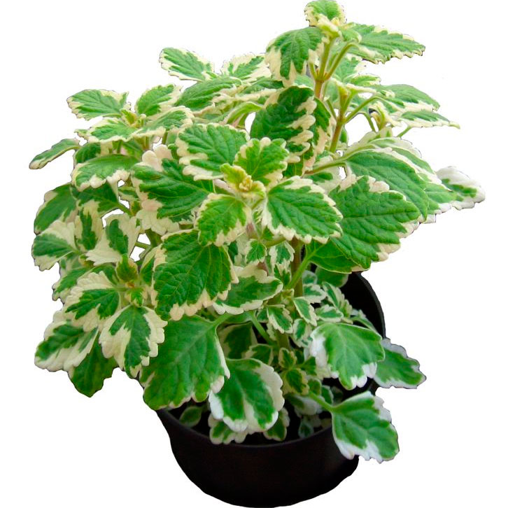 Домашний плектрантус, который еще называют комнатной мятой, представляет собой травянистый многолетник либо вечнозеленый кустарничек, в высоту достигающий от 0,6 до 0,8 м. Система корней мочковатая, а разветвленные стебли могут расти вертикально либо быть стелющимися. Насыщенно-зеленый либо коричневато-красный ребристый стебель имеет небольшое опушение. Душистые яйцевидные либо овальные листовые пластины, которые располагаются супротивно, бывают плотно опушенными или голыми, кромка у них мелкозубчатая. На поверхности листвы находится пестрый узор либо рельеф из прожилок. Цветение наблюдается в летнее время, на кусте появляется пышное короткое верхушечное метелковидное соцветие, в состав которого входят обоеполые цветки сиреневого, голубого, белого либо фиолетового цвета. После созревания плоды раскрываются сами, в них находятся 4 орешка.