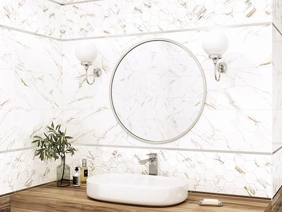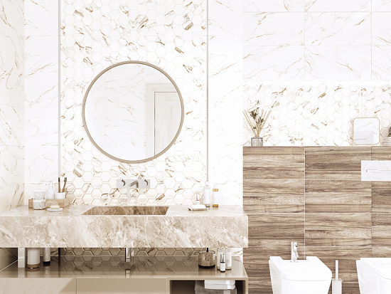 Основу серии составляет плитка под мрамор белого цвета с прожилками. В дополнение к ней идут модули, достоверно имитирующие поверхность обработанной деревянной доски в коричневых оттенках, а завершают картину изразцы с актуальными сегодня шестигранными сотами — стильный акцент, придающий особый шарм облицовке. Благодаря теплой цветовой гамме, керамика Dublin наполняет помещение гармонией и уютом.