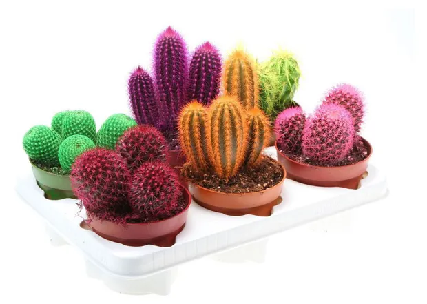 Кактус - неприхотливое экзотическое растение, окрашенное в различные цвета. Вместо листьев на стеблях расположены колючки или волоски. В экстремальных условиях они помогают экономно расходовать влагу, а также впитывать воду и воздух. Поверхность кактуса покрыта воскоподобной кожицей, которая почти не пропускает воду и газы. В опрыскивании и дополнительном увлажнении не нуждается. В период вегетации подкормки проводят 1 раз в месяц удобрениями для кактусов и суккулентов. Во время покоя все подкормки прекращают.
