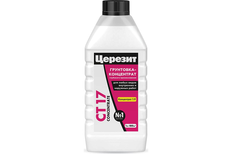 Грунтовка CT 17 Concentrate предназначена для обработки впитывающих, сильно впитывающих и непрочных оснований – бетона, цементных, известковых и гипсовых штукатурок, цементных, гипсовых и ангидритных стяжек, легкого и ячеистого бетона, кладок из керамического и силикатного