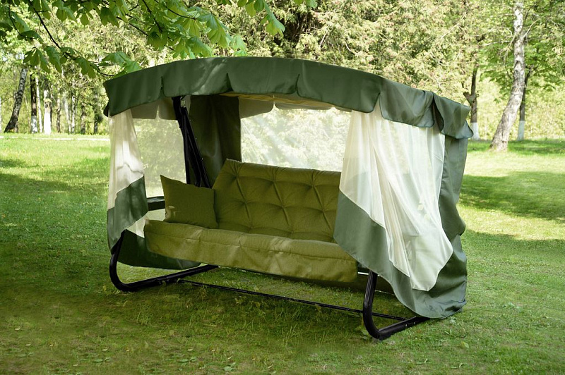 Размеры конструкции позволяют с комфортом разместиться сразу вчетвером. Для защиты от палящего солнца предусмотрен тент.