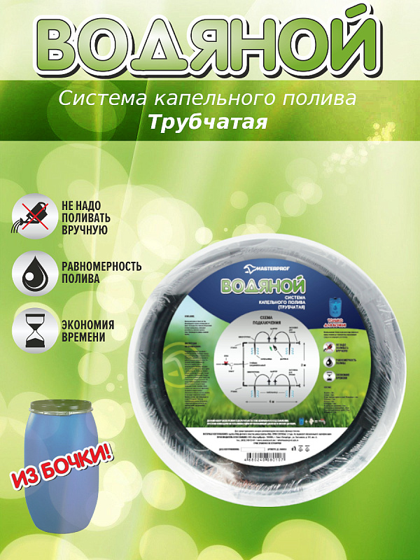 Система капельного полива "Водяной" – это конструкция, которая обеспечивает удобный и бережный полив растений в парниках, теплицах и в открытом грунте. Комплект предназначен для организации дозированной подачи воды в прикорневую зону растений, требующих "тёплого" полива (тыква, томат, огурец, кабачок, перец, баклажан).