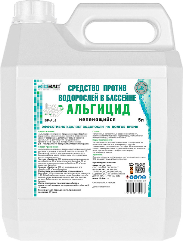 Жидкое средство быстро и эффективно предотвращает рост водорослей в воде бассейна на длительное время; обладает эффектом осветления; рН – нейтрален; не содержит хлора и тяжелых металлов; непенящийся – пригоден для любого типа бассейнов (в том числе SPA). Альгицид непенящийся эффективно удаляет водоросли и делает цвет воды в бассейне идеальным на долгое время.