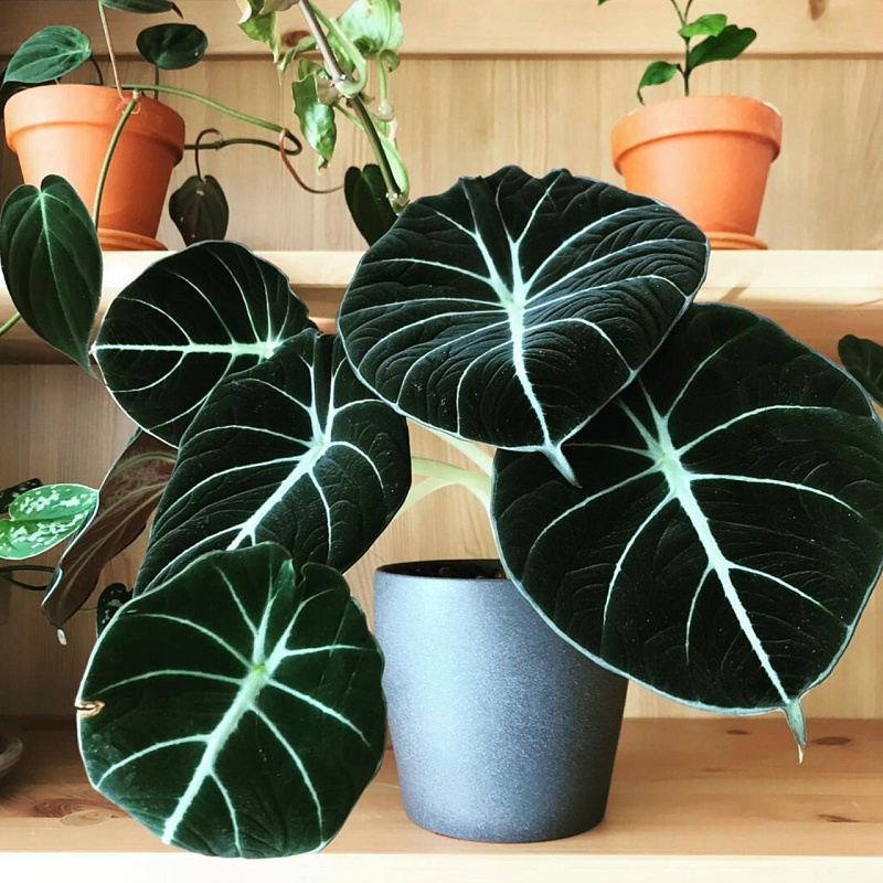 Алоказия ‘Блэк Вельвет’ — это сорт алоказии с неординарным красивым внешним видом, с овальными, почти круглыми листьями. Нижняя поверхность листовой пластинки однотонно-зелёная, а верхняя настолько тёмная, что кажется чёрной. С лицевой стороны лист бархатистый и украшен узором из белых полосок, покрывающих центральную и поперечные жилки. Листья располагаются на светлых тонких стеблях.