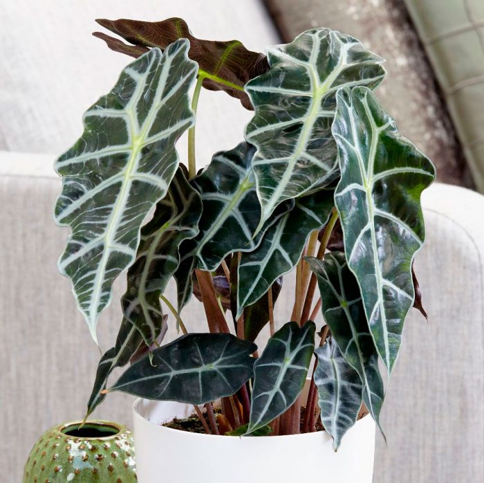 Алоказия представляет собой вечнозеленое растение. Форма кожистых плотных черешковых листовых пластин стреловидная либо заостренно-сердцевидная. Высота некоторых видов не превышает 40 см. Благодаря неприхотливости этого тропического растения им также нередко украшают офисные помещения.