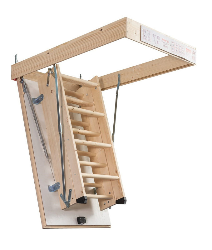 PROF 36 – трехсекционная утепленная лестница из массива сосны. Несмотря на простоту имеет уплотнитель по контуру люка и оснащена поворотным замком, надежно фиксирующим люк в закрытом состоянии. Поставляется в комплекте с пластиковыми ножками