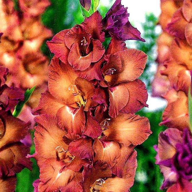 Гладиолус – клубнелуковичное растение высотой 50-150 см с вертикальным стеблем и линейными или мечевидными листьями. Цветки воронковидные, собраны в колосовидное соцветие до 80 см длиной, самых разнообразных окрасок, могут быть простыми или гофрированными.