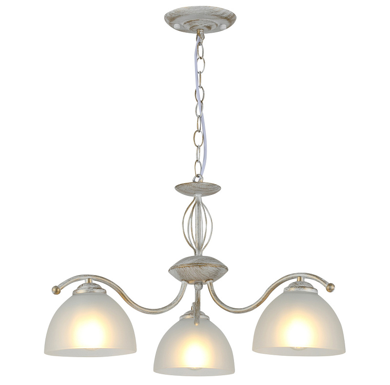 Данная модель – люстра потолочная подвесная с 3 стеклянными матовыми плафонами белого цвета. Корпус люстры с декоративным состариванием окрашен гальваническим способом в белый цвет. Подвес люстры декорирован цепочкой, убрав звенья которой, можно легко отрегулировать высоту люстры при монтаже на потолок. Уютный свет люстры без бликов достигается применением матового стекла при изготовлении плафонов. Источники света в эту современную люстру классического стиля – Е27 40 Вт.