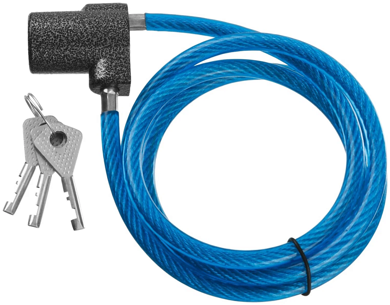 Замок навесной дисковый с тросом. Предназначен для велосипедов, колясок, санок, лодок и тп. Материал корпуса замка - силумин, покрыт полимерной краской. Дужкой замка выступает гибкий вращающийся стальной трос, защищенный пластиковой оплеткой. Диаметр троса - 5 мм, длина - 1260 мм. Габариты корпуса - 41х44х27 мм. Замок комплектуется 3 ключами.