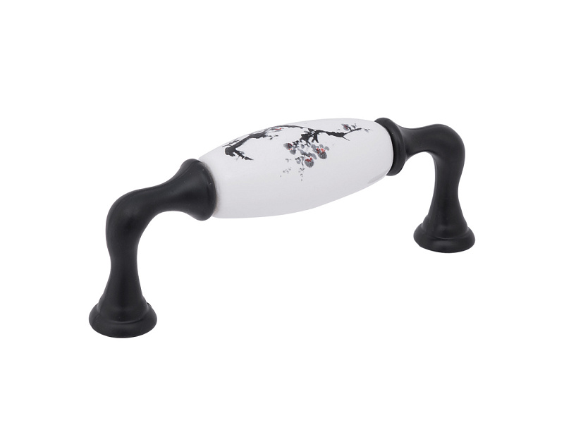 В дизайне скобы интересный микс стилей. Белая гладкая вставка под фарфор и обтекаемая форма характерны для моделей в стиле прованса. Но монохромный цветочный узор может относиться и к восточным направлениям, напоминая рисунок тушью, похожий на японскую живопись. Матовое покрытие металла прочно ассоциируются с минимализмом и лофтом.