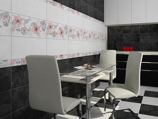 В набор входят базовые и мозаичные модули, керамогранит, бордюры и декоративные элементы. Создатели плитки использовали два ключевых цвета – серый и красный. Палитра темно-серых, серых и светлых оттенков хорошо смотрится как в больших, так и в маленьких пространствах. А мозаика и декоры с причудливыми рисунками дают возможность создавать интересные комбинации. Законченность интерьеру придаст напольная плитка. Она имеет классический внешний вид – с текстурой натурального камня и матовой поверхностью в светло- и темно-сером цвете. Формат 400 х 400 мм удобен для укладки в любых по площади помещениях. Настенная облицовка выпускается в размерах 250 х 500 мм.