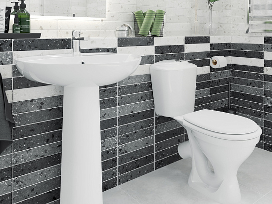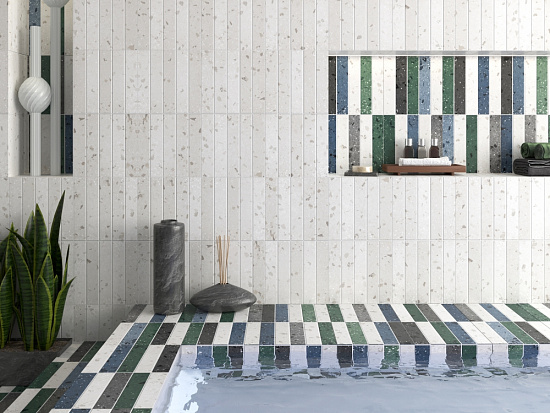 Коллекция плитки для стен 600х300 мм Морена вдохновлена движением ледников. Все камни и минералы, что собрал и искрошил ползущий ледниковый щит, перемешаны в богатую пеструю мозаику плитки терраццо на структурной основе с фальш-швами. Основная плитка представлена в черной и белой цветовых схемах, а для придания контраста и расстановки дополнительных акцентов предусмотрен декор с отсылкой к морским глубинам с пестрым паттерном на структурной основе.