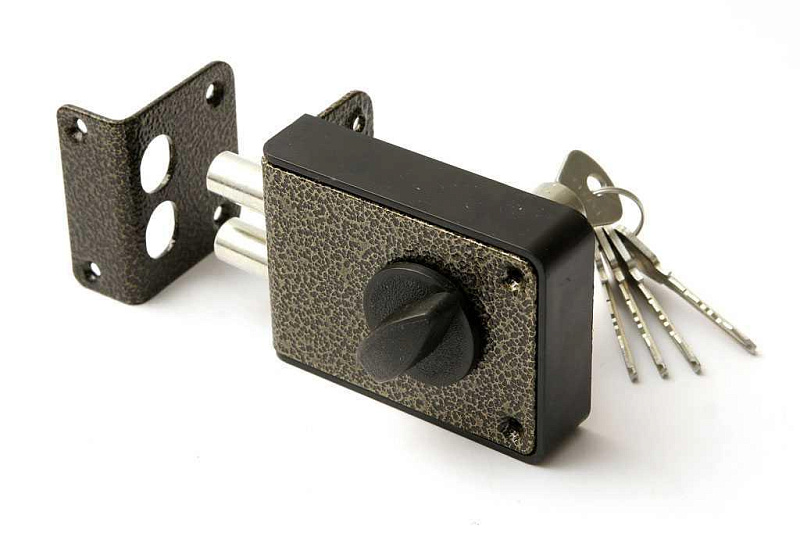 Замок накладной цилиндровый с вертушкой. Предназначен для установки на деревянные двери. Засов из двух цилиндрических ригелей диаметром 14 мм, с максимальным вылетом 25 мм. Удаление ключевого отверстия - 60 мм. Габариты замка - 100х75х24,5 мм. Комплектация - 5 ключей, запорная планка, накладка. Закрывание и открывание замка изнутри производится ручкой, снаружи ключом. Корпус из ударопрочного пластика со стальной пластиной.