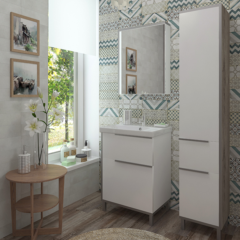 Коллекция выполнена в стиле минимализм. Привлекательный, лаконичный дизайн и ничего лишнего. Комплект изготовлен в двух цветах — белый глянец и апрельский нордик. Такое сочетание привносит в интерьер ванной комнаты благородство, тепло и уют.