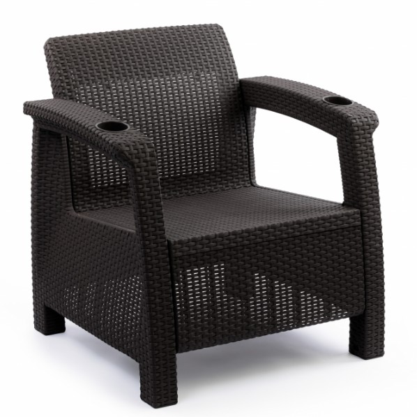 Кресло произведено из высококачественного полипропилена, имитирующего плетение из ротанга. Кресло имеет одно посадочное место, допустимая нагрузка на одно посадочное место - 106 кг . На подлокотниках дивана расположены отверстия для напитков.Кресло может стать идеальным решением по оформлению зоны отдыха в доме, на садовом участке, в офисном помещении или в кафе. Благодаря цветовым решениям, кресло подойдет под любой интерьер.