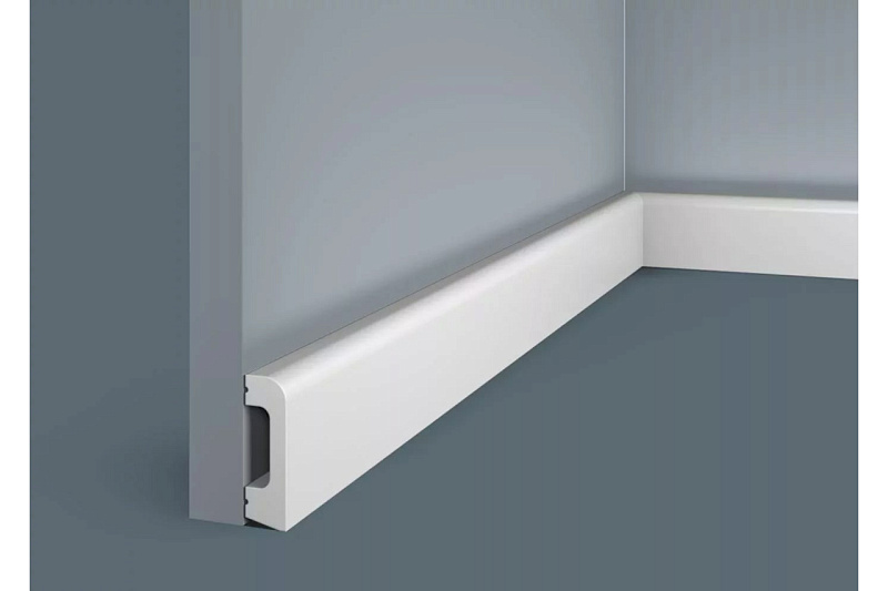 Гладкая форма без узоров делает плинтус отличным вариантом для отделки помещения в современном стиле. Материал экополимер отличается пожаробезопасностью и устойчивостью к влаге.