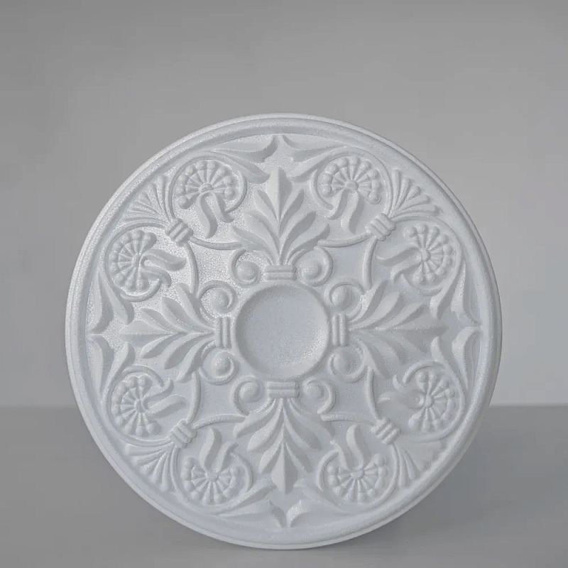 Потолочная розетка - декоративный элемент для оформления интерьера. Используется в качестве украшения области крепления люстры, настенных светильников и как самостоятельный предмет декорирования. Изделие выполнено из полистирола, имеет объемный узор. Представлено в индивидуальной упаковке. Окрашивается вододисперсионными красками. Монтаж на сухую и ровную поверхность - на специальный монтажный клей.