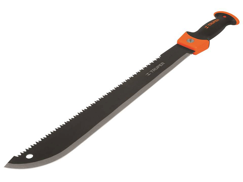 Двустороннее мачете 450 мм Truper MACH-18 15893 представляет собой длинный нож для вырубки густых зарослей на тропинках, а также для уборки сахарного тростника. Инструмент имеет двустороннюю заточку. С одной стороны располагается гладкое лезвие, а с другой - лезвие с зубчиками. Мачете удобно лежит в руке в процессе работы благодаря эргономичной рукоятке.