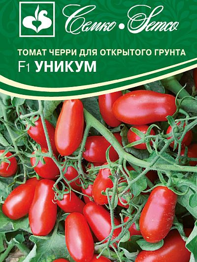 Томат Уникум F1 - ранний, детерминантный гибрид томата черри для открытого грунта. От всходов до созревания 80-85 дней. Растение с хорошим ростом, штамбовое, хорошо облиственное. Томаты цилиндрические, выровненные по форме, тёмно-красные, массой 25-30 граммов. Помидоры очень устойчивы к растрескиванию. Содержание сухого вещества 5,7-6,2%, сахарокислотный индекс свыше 6,8%. Новое достижение во вкусе помидоров черри. Томат Уникум F1 устойчив к вертициллёзу (V), мучнистой росе (Lt), нематоде (N), бактериозу (Pst), вирусу бронзовости (TSWV). Используется для консервирования без кожицы и приготовления томатного пюре, а также для свежего потребления. Пригоден для машинной уборки. Урожайность 6,5-8 кг/м2.