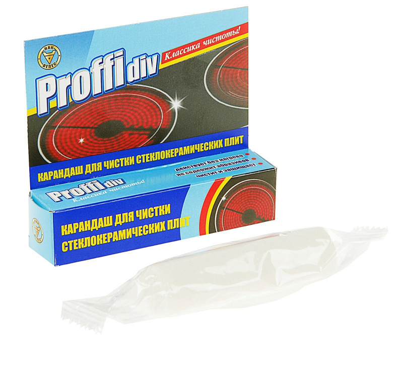 Карандаш Proffidiv для чистки стеклокерамических плит предназначен для быстрого, эффективного и безопасного удаления различных устойчивых, пригоревших загрязнений, остатков пищи, нагаров с варочной поверхности стеклокерамических плит.