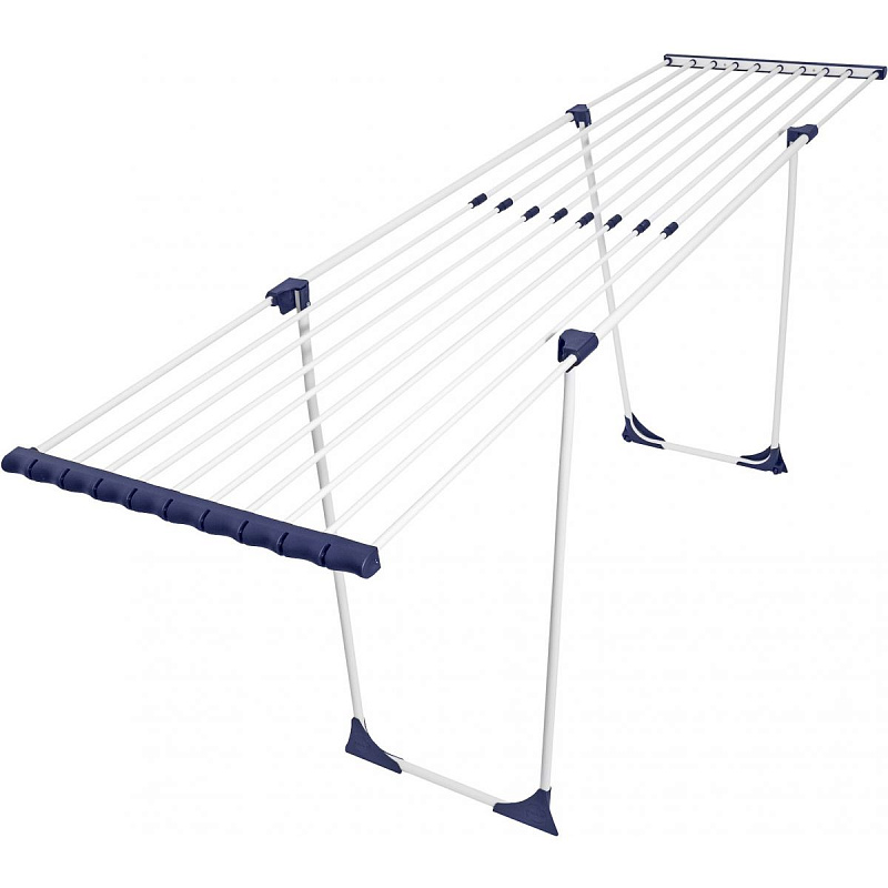 Раздвижная напольная сушилка для белья casaFlex с рабочей длиной прутьев от 10 до 20 метров. Конструкция сушилки спроектирована таким образом, что позволяет размещать очень длинные предметы длиной до 2-х метров, такие как шторы, постельное белье, скатерти и так далее. Имеется встроенный держатель для носков. Благодаря толстым прутьям размещённые на сушилке предметы будут сохнуть быстрее. П - образные ножки с 4-мя широкими уголками и двумя колесиками обеспечивают максимальную устойчивость, а так же возможность перемещать сушилку даже при полной загрузке. Рассчитана на 17 кг одежды.
