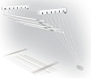 Сушилка для белья стальная с полимерным антикоррозийным покрытием. 2 варианта крепления: к стене и к потолку. 2 стальных направляющих-крепления, оснащены роликами и веревками, к которым прикреплены 6 штанг, длина штанги 180см, общая длина использования 6м, для удобства подъёма и спуска штанг в комплекте имеется трубка с крючком на конце, сушилка оптимальна для использования в ванной, либо на балконе или лоджии.