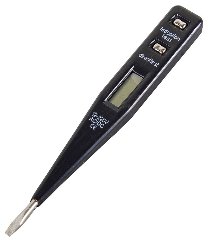 ЖК дисплей позволяет не только определять наличие напряжения, но и его величину (от 12В до 220В). Тестер выполнен в прямоугольном корпусе с щупом-отверткой. Индикатором служит светодиод и жидкокристаллический дисплей. Для проверки целостности проводника следует коснуться пальцем контакта на тестере, а жалом дотронуться одного конца проводника. Свободной рукой коснуться другого конца проводника. Если проводник цел, то светодиод и звуковой сигнал сработают. Эти работы проводятся только при отключенном электропитании! Тестер оснащен боковой клипсой, удерживающей прибор в кармане.