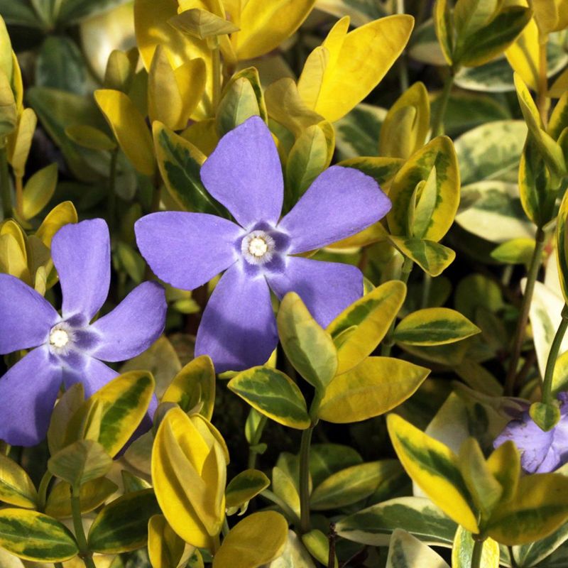 Барвинок малый Blue and Gold (Блю энд Голд) Барвинок густым красивым ковром покрывает землю, радуя окружающих свежей зеленью с ранней весны и до поздней осени, его можно найти даже под снегом. Красивые нежные голубые цветки, рассыпанные среди выразительных листьев, становятся украшением этого зеленого покрова. Растение выращивают как декоративное для территорий, которые мало подходят изнеженным садовым цветам. Вечнозелёный многлетник. Лист жёлто-зелёный, широко-ланцетный, с жёлтой каймой. Побеги отрастают в год 30-80 cм, стелятся и укореняются - покрывают плотно землю. Лучше растёт в полутени или тени, на умеренновлажных почвах. Лучше высаживать по 10 шт/м2. Достаточно морозостоек. Цветение с мая по сентябрь синими цветками.