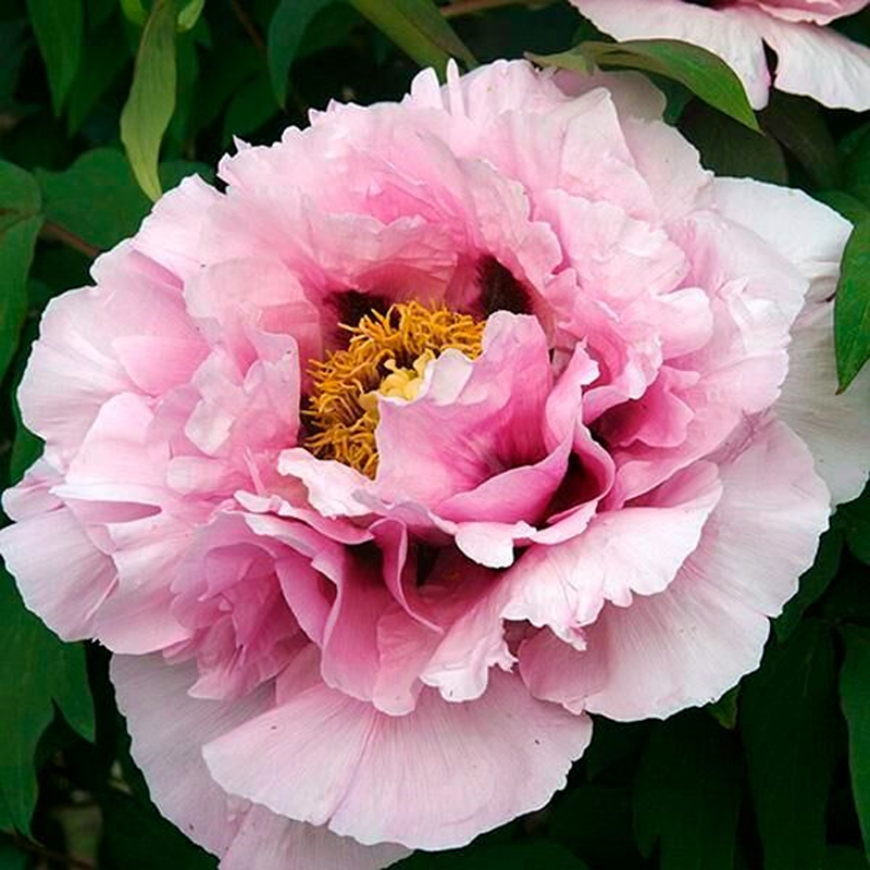 Пион Розовая Река. Сорт сильнорослый, куст высотой 120-150 см. Стебли пиона толстые и прочные, что делает его более устойчивым к внешним воздействиям. Рост энергичный. Цветок крупный, диаметр составляет 17 см. Окраска цветка нежно-розовая по краям, у основания - насыщенный фиолетовый оттенок. При этом некоторые цветки могут быть двухцветными, что создает дополнительный интерес, края также имеют нежно-розовую кайму. Форма цветка корончатая. Цветет рано в конце мая-начале июня и продолжается около 2-х недель. Обладает тонким нежным ароматом. Сорт нетребователен к почве, устойчив к болезням и вредителям. Купленные весной саженцы необходимо высадить в апреле-мае, когда почва прогреется до +10...+12°С. Посадочная яма должна быть шириной и глубиной не менее 40-50 см, на дно насыпают горкой почвенную смесь. Затем туда помещают саженец, аккуратно расправляют корни (они должны свободно располагаться, не загибаясь) и присыпают землей. Корневую шейку при посадке надо немного заглубить. Она должна быть примерно на 5 см ниже уровня почвы. Это предохранит почки возобновления от перепадов температур зимой. После посадки землю утрамбовывают и обильно поливают.