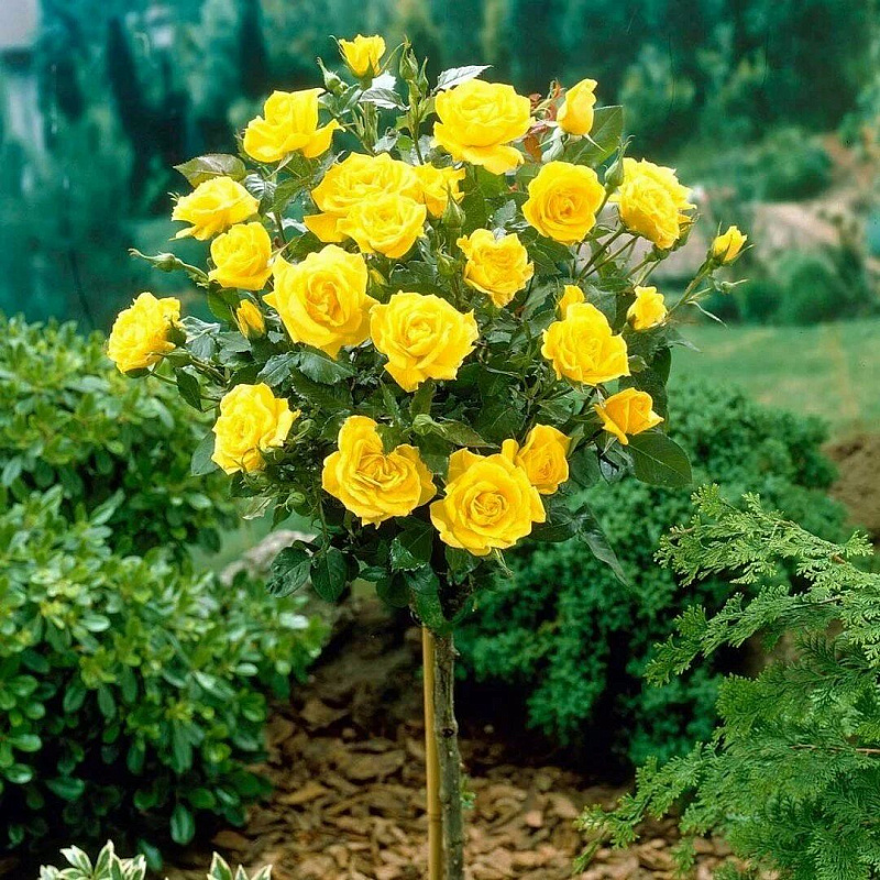 Штамбовые розы – это результат прививки культурного сорта розы в стебель (штамб) шиповника. Представляют собой деревце с голым стволиком и пышной кроной. В зависимости от высоты прививки штамбовые розы могут карликовыми (30-50 см), со средней высотой (50-80 см), стандартные (80-150 см) и высокие (выше 150 см). Розы на штамбе идеальны в саду в групповых посадках, прекрасно сочетаясь с кустарниковыми или многолетними травянистыми растениями в цветочных ярусных композициях или в одиночных посадках, например, на газонах, а также они отлично подходят для выращивания в зимнем саду, в контейнерах на балконах, террасах и зонах патио. Штамбовые розы нуждаются в удалении дикой поросли ниже места прививки на стволике или в прикорневой зоне. В средней полосе России и севернее розы на штамбе следует обязательно укрывать!